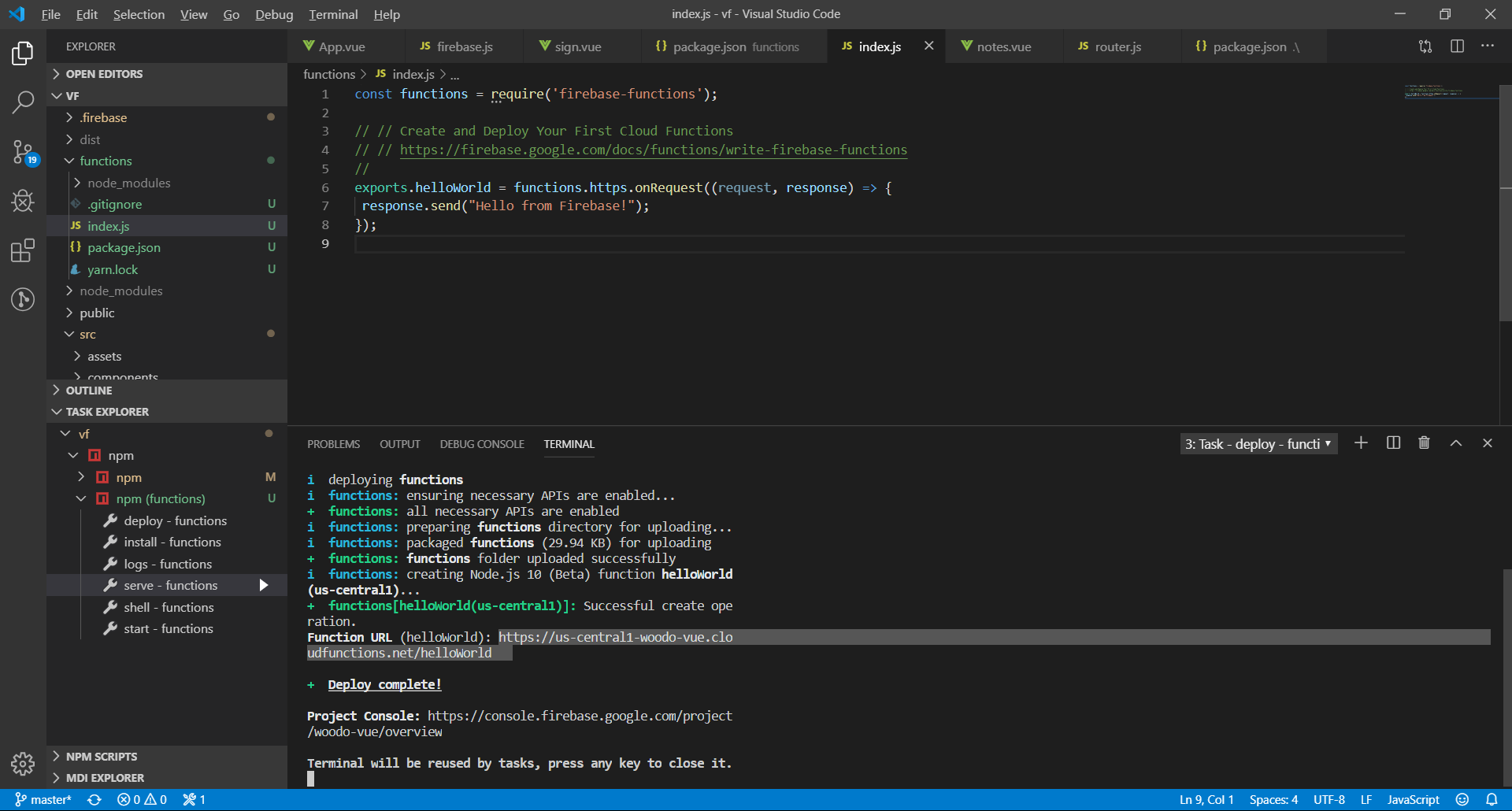 functions들을 실행하면 https://us-central1-woodo-vue.cloudfunctions.net/helloWorld와 같은 URL이 생성되는데 접속하면 hello world가 출력되는걸 확인할 수 있음