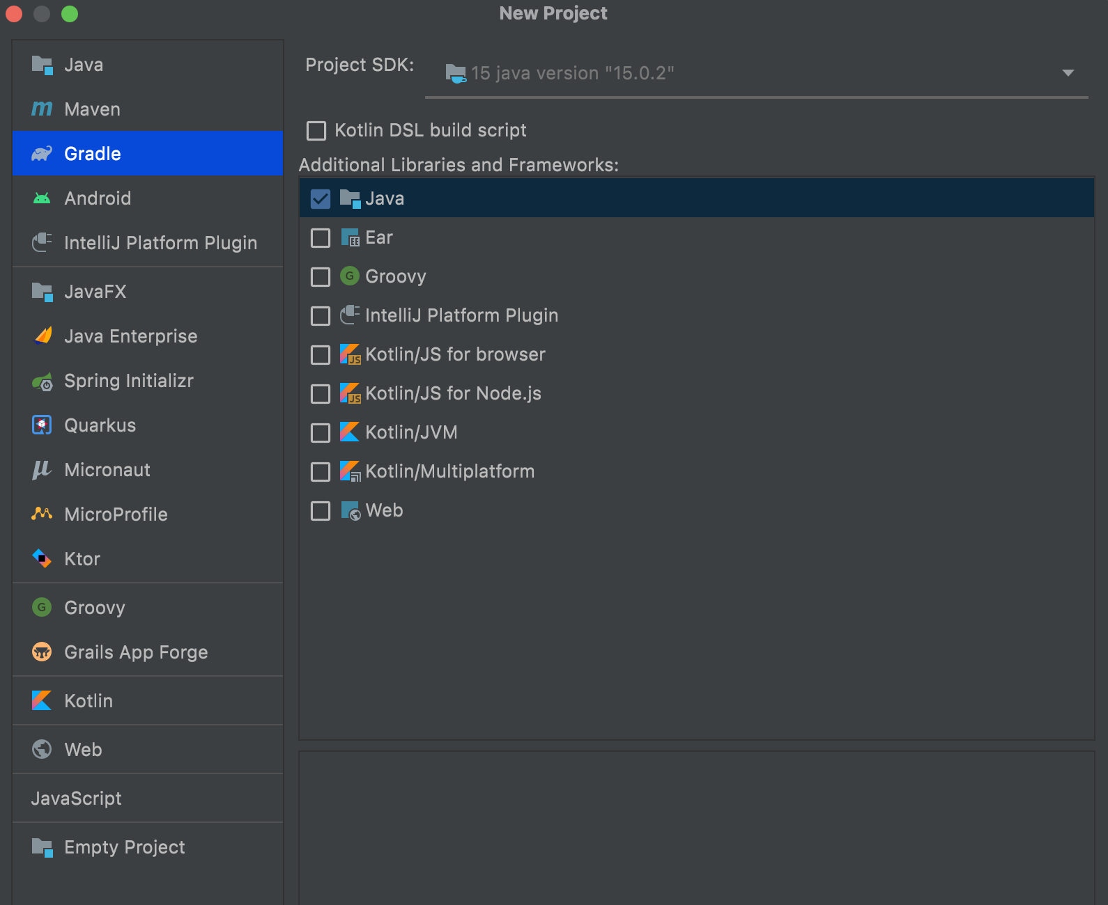 MacOS IntelliJ 기준 File→New→Project 경로에 위의 사진처럼 Gradle 프로젝트를 하나 생성한다.