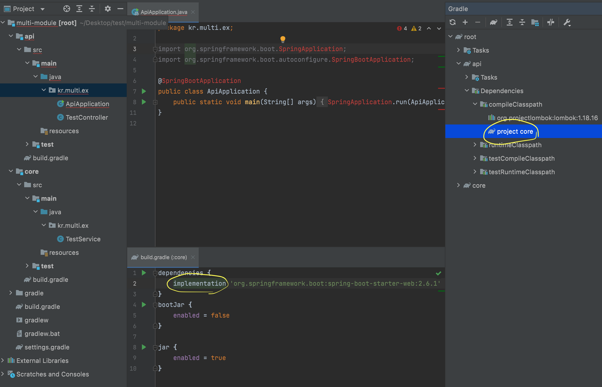 여기서 중요한 것은 bootJar와 jar다 bootJar은 실행가능한 jar를 만들려 하기 때문에 main()이 필요하다 그렇기 때문에 main()이 없는 core는 enabled를 false로 해줘야하고 결론적으로 저걸 넣지 않으면 추후 core에 있는 Bean Class를 다른 모듈에서 사용할 때 에러가 발생할 수 있다.