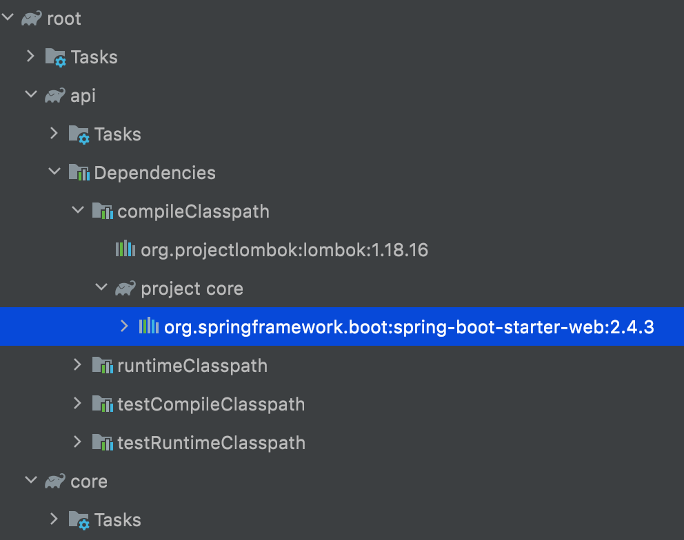 이제 gradle을 갱신하면 root의 build.gradle subprojects에 선언한 lombok과 spring-boot-starter가 추가된 것을 확인할 수 있다.