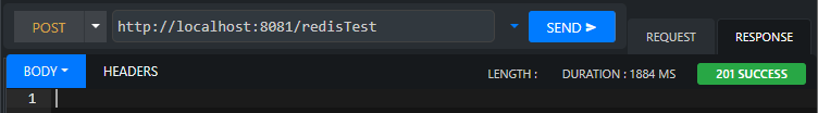 일단은 값을 넣어주는 역할을 하는 /redisTest 만 POST method로 호출을 해본다. CREATE 응답 코드인 201 SUCCESS가 나오며 Redis로 값이 들어간것 같다. 확인을 해보자.