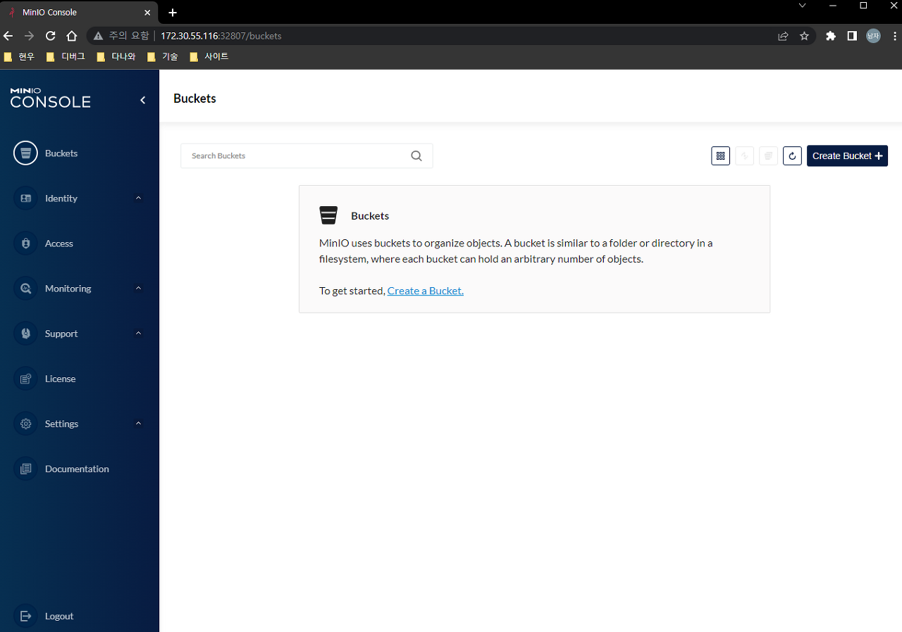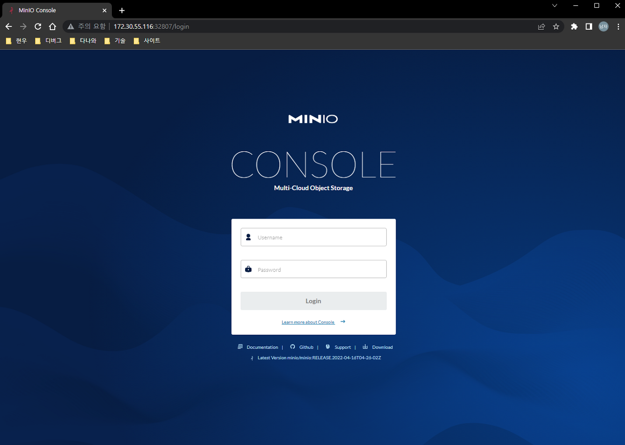 # 초기 계정과 패스워드는 minioadmin 이다